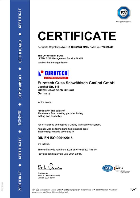 Consistent quality awareness is a central part of the corporate philosophy of Eurotech Guss Schwäbisch Gmünd GmbH. That is why we have integrated quality assurance and the sustainability aspect directly into the overall process flow. To ensure quality testing, Eurotech has fully equipped measuring rooms with CNC measuring machines. We use patented measurement programs or programs provided by the customer, if desired.