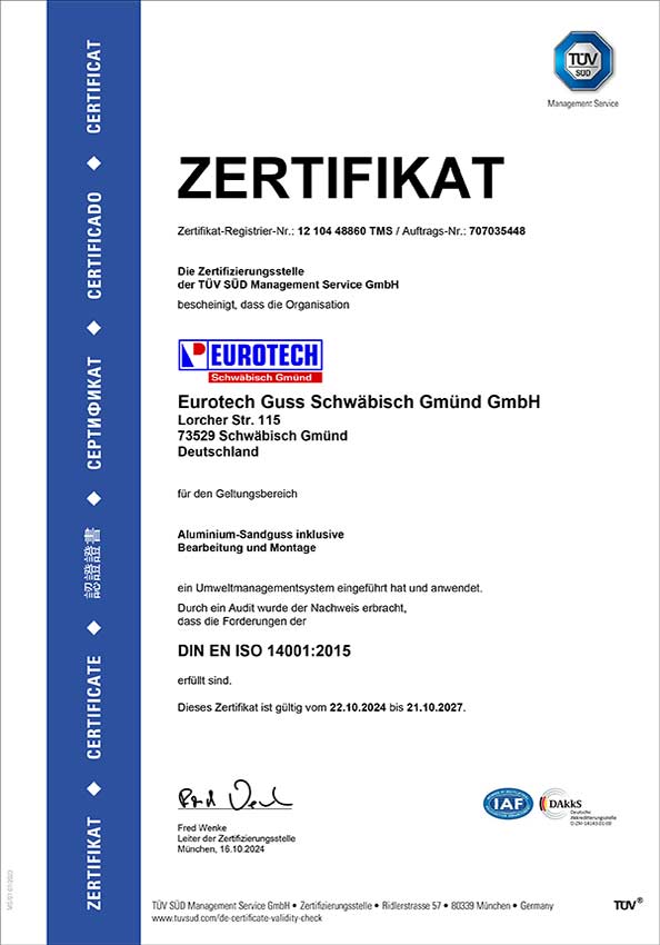 Konsequentes Qualitätsbewußtsein ist ein zentraler Bestandteil der Unternehmensphilosophie der Eurotech Guss Schwäbisch Gmünd GmbH. Deswegen haben wir die Qualitätssicherung und den Nachhaltigkeitsaspekt direkt in den gesamten Prozessablauf eingebunden.